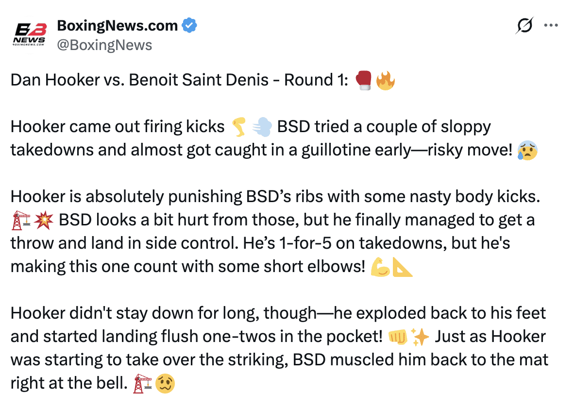 Hooker was coming off a 2nd-round submission loss to Arman Tsarukyan just over two months ago at UFC Qatar (November 2025). Prior to the Tsarukyan defeat, Hooker was on a three-fight winning streak, including a decision victory over Mateusz Gamrot. Meanwhile, Saint Denis was fresh off a 16-second knockout of Beneil Dariush at UFC 322 in November. Saint Denis finished all three of his opponents in 2025, with two submissions and that KO of Dariush. He has now added Hooker to that list. Here is how the fight played out live.