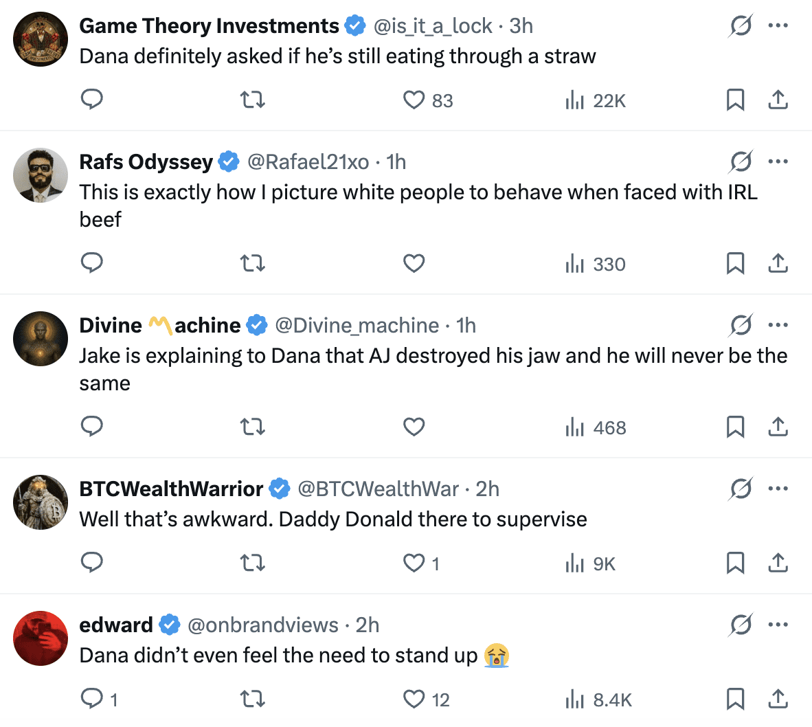The interaction appeared to show White inquiring about Jake’s broken jaw from his sixth-round stoppage loss to Anthony Joshua, with Paul confirming the injury. Paul had four titanium plates surgically implanted to repair the fracture. And yet, White had previously described the Paul-Joshua bout was a "f***ing bad idea," stating all those involved should be "embarrassed."