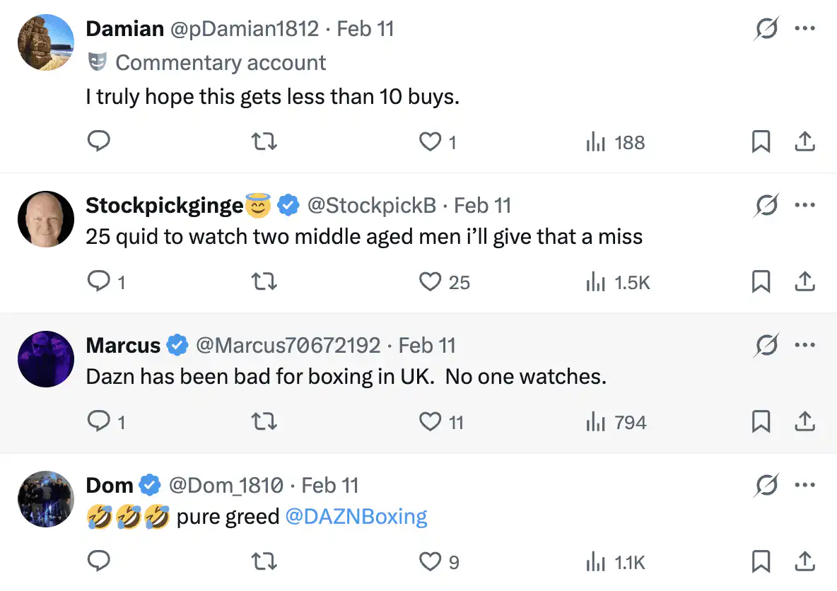 Meanwhile, Chisora is on a three-fight winning streak, having beaten Gerald Washington, Joe Joyce and Otto Wallin, respectively. Regardless of the outcome, Chisora has confirmed that this 50th professional fight will be his retirement bout. While DAZN was introduced with a view to ending PPV, the recent price increases have not gone down well. DAZN recently launhced their ultimate plan, costing $44.99 a month ($539.88 annually or $449.99 upfront).