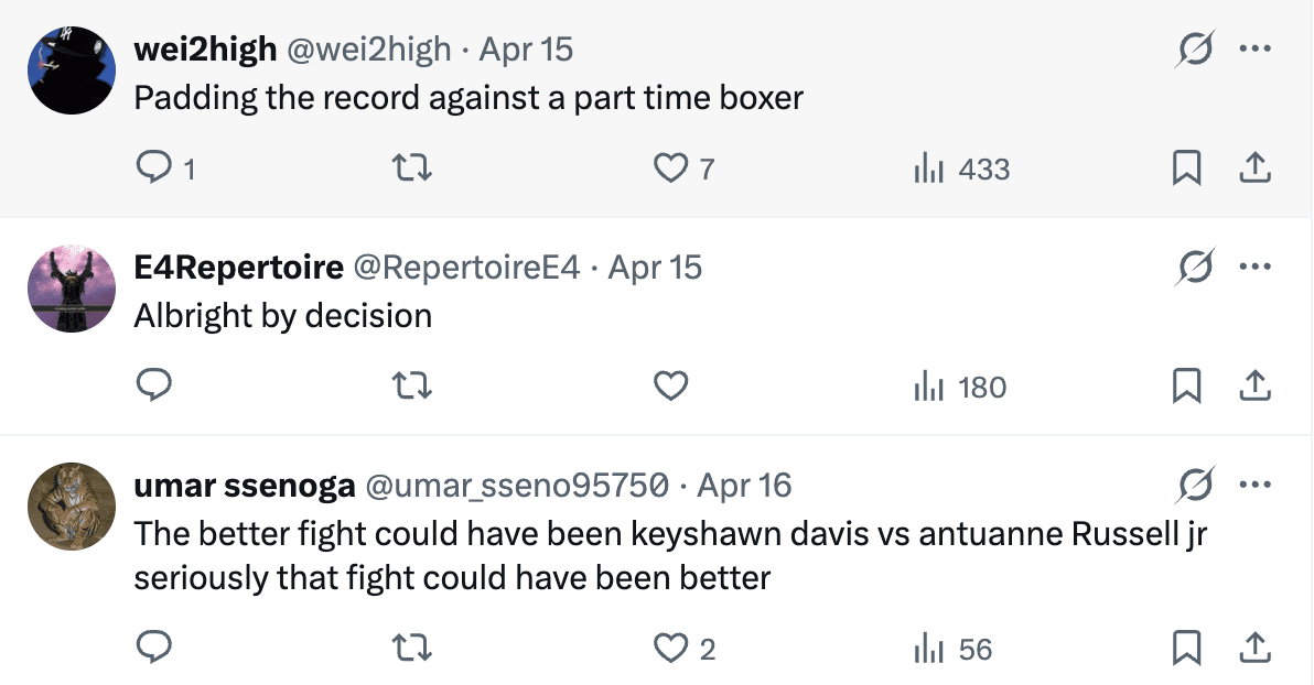 The pair first met in October 2023. While Davis initially walked away with a majority decision, the result was later overturned to a no-contest after he tested positive for marijuana. The rivalry reached a boiling point in June 2025. After Albright defeated Keyshawn’s older brother, Kelvin Davis, a heated backstage confrontation occurred when Keyshawn reportedly entered Albright’s locker room.