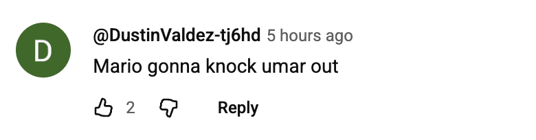 "To be honest, no — right now [Bautista is] 8-0 in UFC. It’s good results and I think he deserve to fight with me. And who else? Everybody was like ‘no,’ or they injured, or they have booking already fights. I think it is nice striker and I think we’re going to show good fight," Umar said