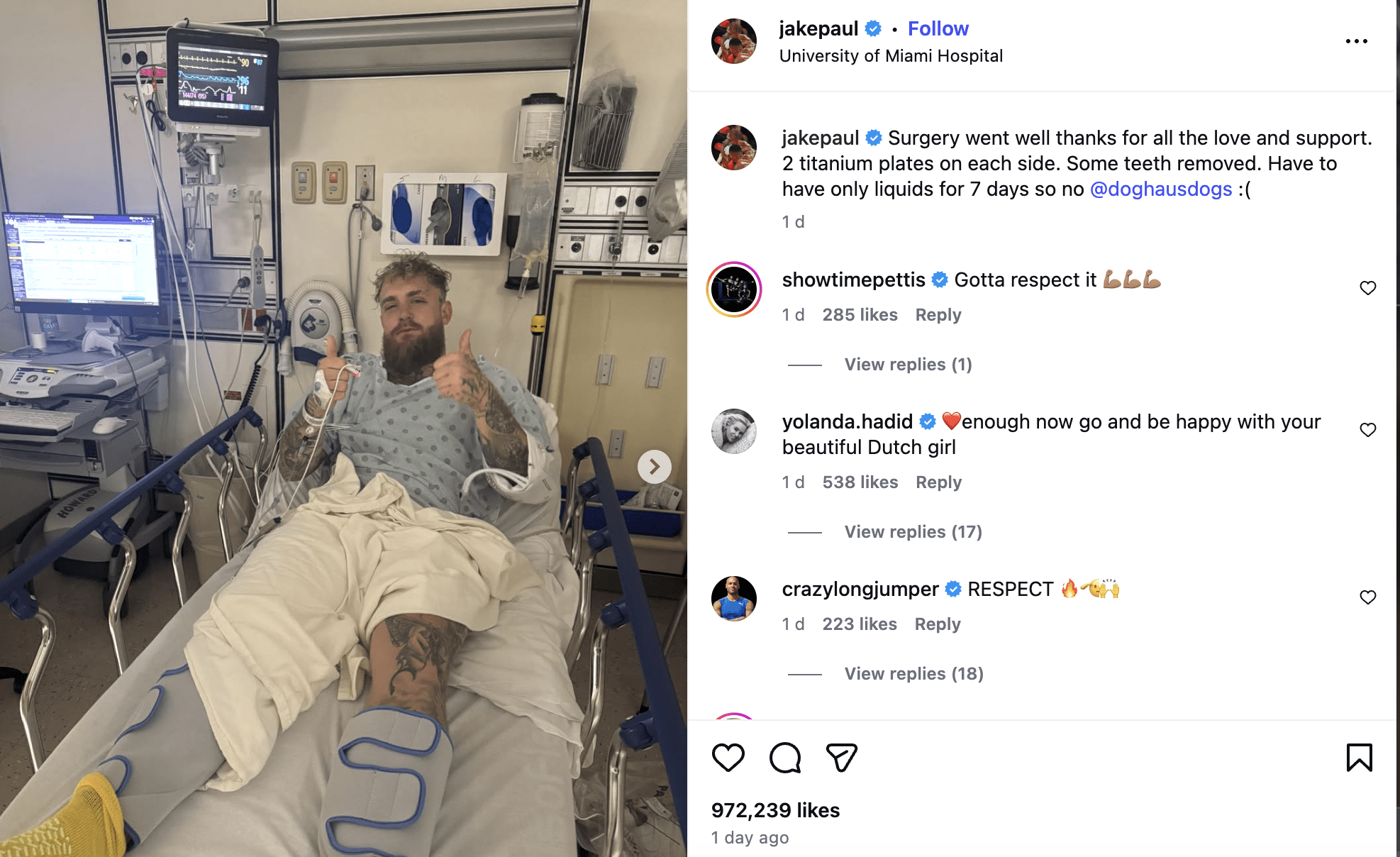 Joshua dropped Paul four times throughout the bout. The final blow—a devastating right hand in the sixth—shattered Paul’s jaw in two places. Surgeons at Miami University Hospital inserted titanium plates to stabilize the fractures. Paul shared images from his hospital bed, confirming that everything went "smooth," though he faces a week on a strict liquid-only diet due to significant pain and stiffness.