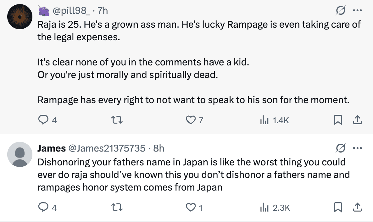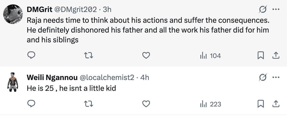 "I don’t f—- with Raja right now. I’m mad at him. I’m here for his legal fees, but Raja wants to be an adult, he wants to do things his way. He won’t take my advice, I can’t make him do anything. Look, he’s my son, I love him dearly, but he dishonored my name. I can’t even put into words how upset I am with my son. He dishonored my name. I’ve been in this sport for a long time, and when he did what he did, everything said, ‘Son of MMA’s Rampage.’